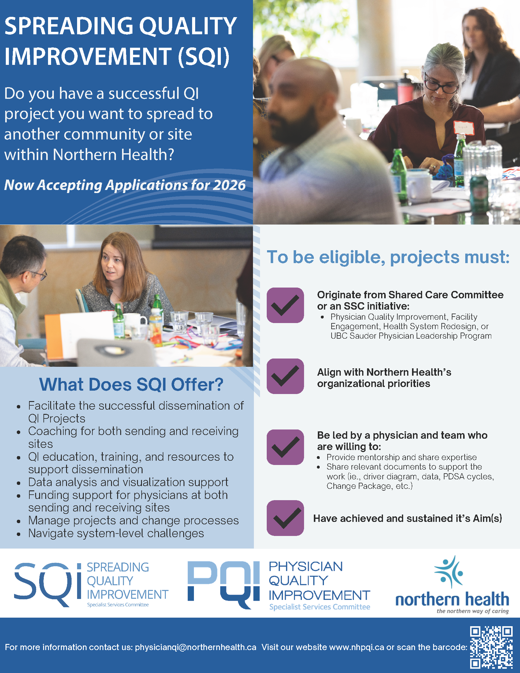 Northern Health’s Spreading Quality Improvement (SQI) program supports the spread of successful physician‑led quality improvement (QI) projects to new sites and communities across the region. If you have a QI initiative that has demonstrated success and would benefit patients and teams in other locations, we want to hear from you.